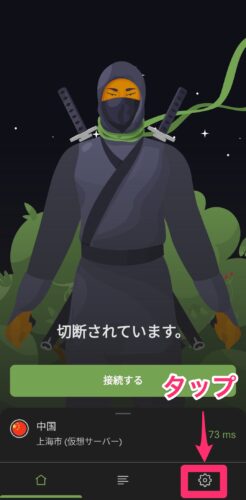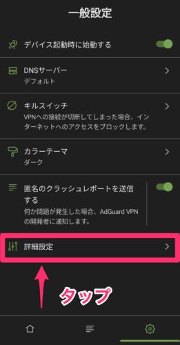 1.AdGuard VPNのホーム画面の下部の「設定」をタップ