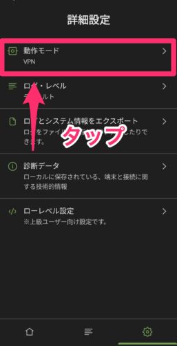 AdGuard VPNと広告ブロッカーはモバイルアプリで併用モードをオンにすることで使えるようになります。初期設定ではVPNモードに設定されているので、ホーム画面の詳細設定から「AdGuardとの併用モード」を選択してオンにする必要がありますよ。