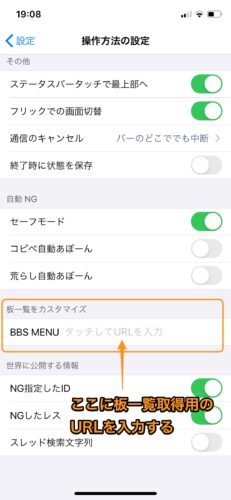 操作方法の設定画面で少し下にスクロールすると「板一覧をカスタマイズ」という項目と、入力欄が出てきます。