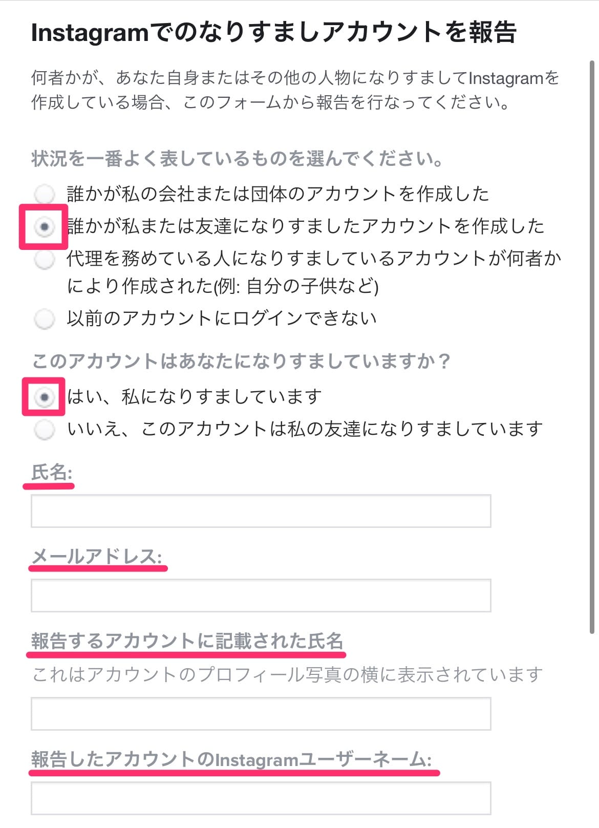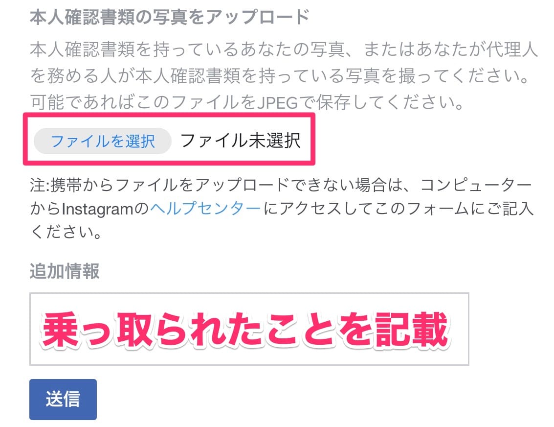 インスタの「なりすまし報告ページ」からアカウントを乗っ取られた旨を明記して、アカウントを削除してもらいましょう。