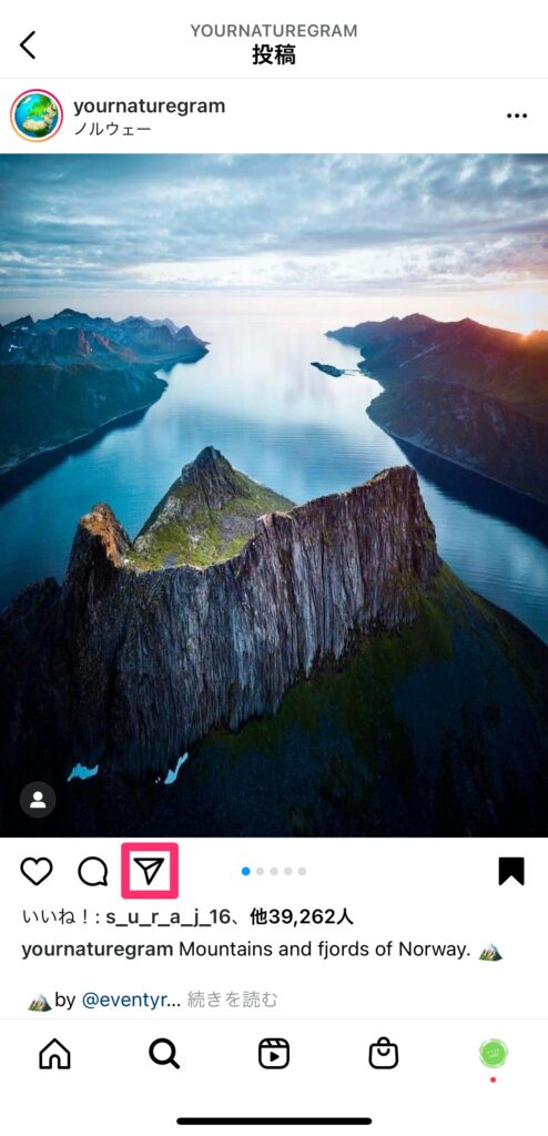 - 保存したい投稿のシェアボタン(紙飛行機みたいなアイコン)をタップ