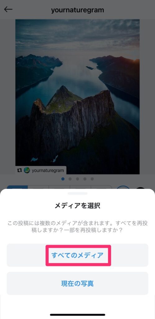 複数枚の投稿の場合は、全ての写真を保存するかどうか聞かれますので、好きな方をタップして下さい。