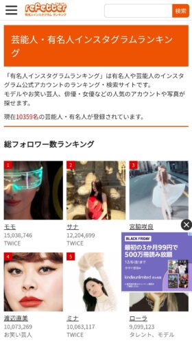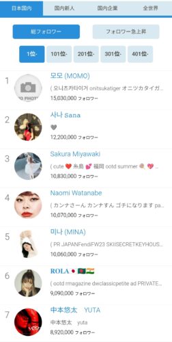あなたがインスタグラムを始めて、フォロワーの多い人気芸能人のアカウントからフォローしたい場合は、「Instagram人気ランキング」を参考にフォローを進めていくと良いでしょう。