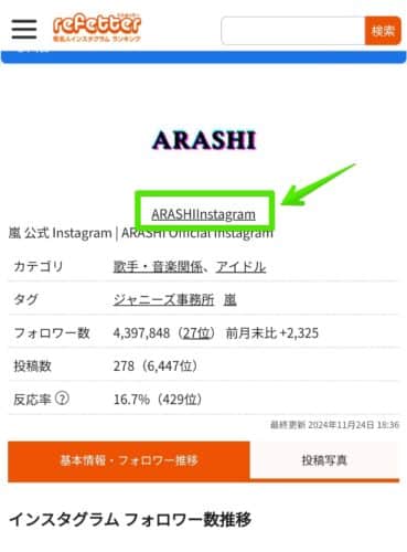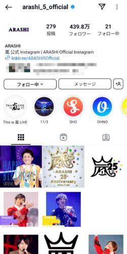 例えば、有名アイドルグループ「嵐」のインスタグラムアカウントをフォローしてみます。