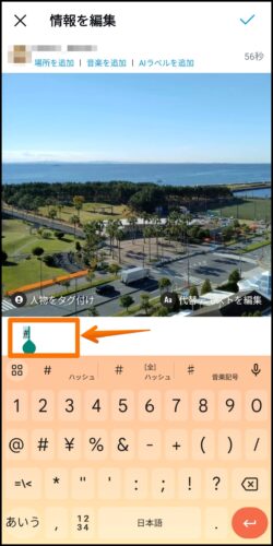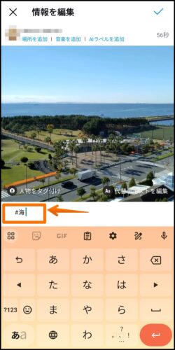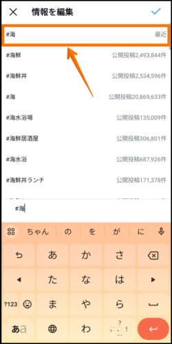 今回は「海」というハッシュタグをつけたいので、キーボードから「海」と入力します。