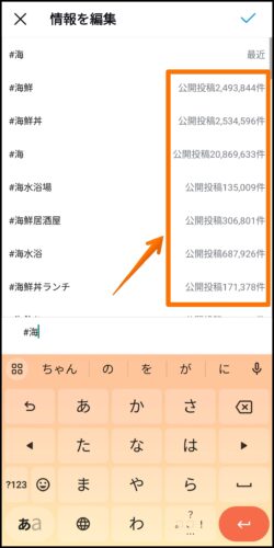 候補として出てくるハッシュタグの横に表示されているのは、該当のハッシュタグを使ってインスタグラムで公開投稿された件数です。
