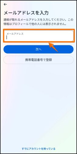 画面中央にある「メールアドレスで登録」をタップしてください。