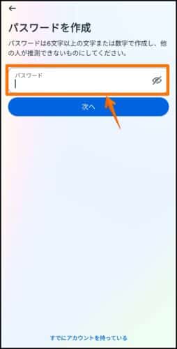 パスワードは6文字以上の文字と数字を使って作成する必要があります。