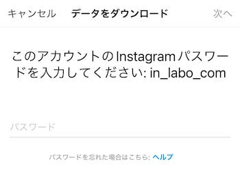 データの送信先を入力し、インスタグラムのパスワードを入力