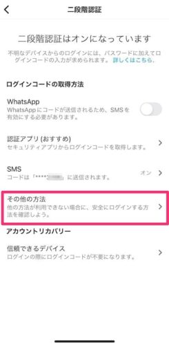 その後「リカバリーコード」を選択して、控えておいたコードのいずれかを入力すればログインできます。
