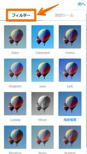 パソコン版インスタグラムでは、加工(フィルター)の種類は12種類のみ。