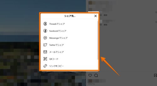 パソコン版インスタグラムでは、投稿した画像や動画のメニューから「シェア先」を選び、手動で投稿を連携する必要があります。