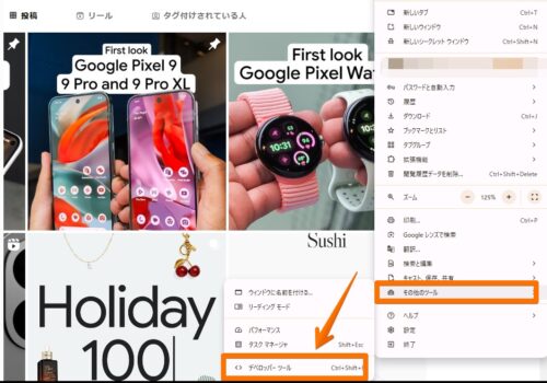 パソコン版インスタグラムでストーリーを投稿する場合は、「デベロッパーツール」を開き、モバイル版表示に切り替える必要があります。