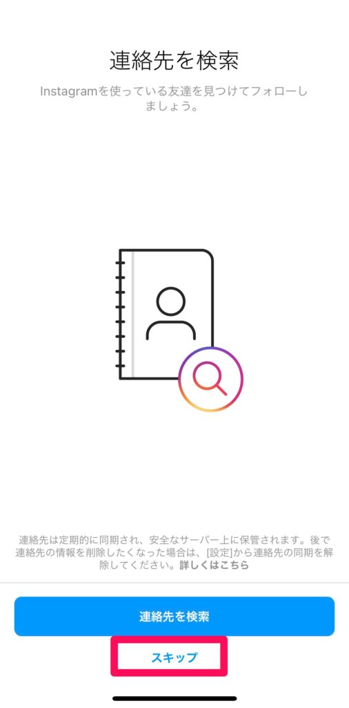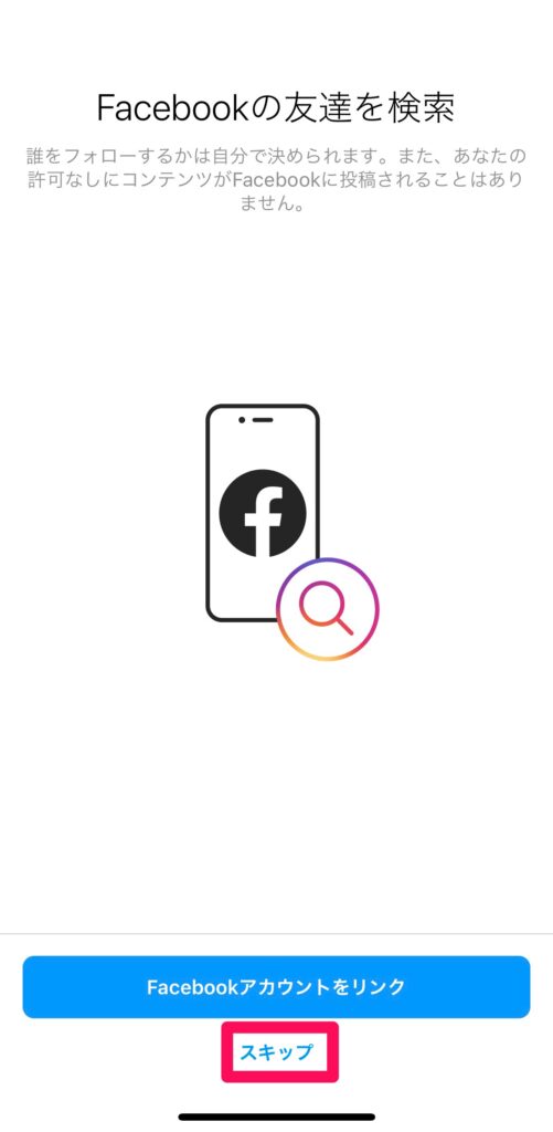 アカウントを作る際、インスタグラム からFacebookのアカウントや、スマホの連絡先とリンクすることをおすすめされますが、承認しないでください。