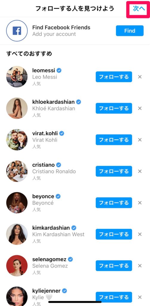 この段階でもFacebookの連絡先や、あなたと関連のあるアカウントへのフォローを勧めらめますが、全て無視です。