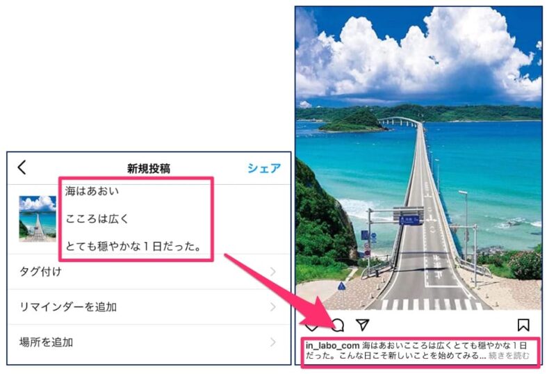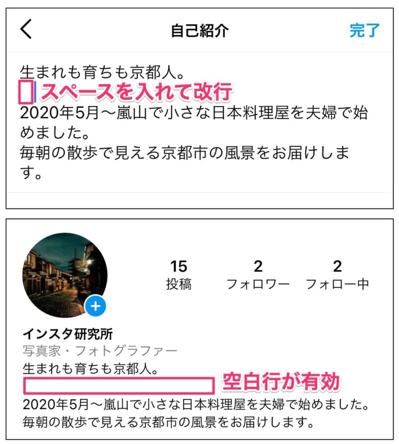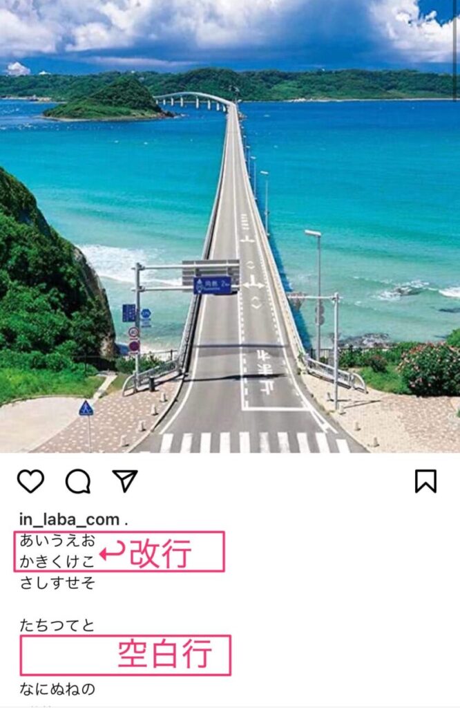 インスタグラムで有効となる改行や空白行は文章を入れる場所(投稿文、プロフィール文、コメント)で変わります。
