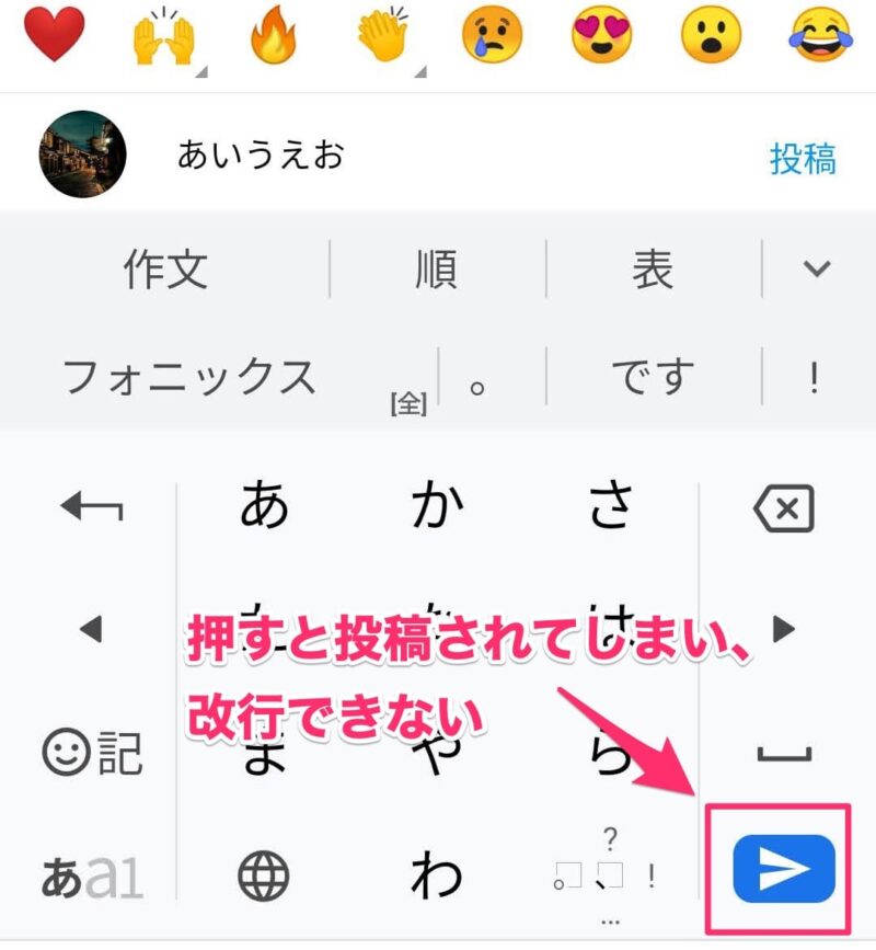 コメント入力時はキーパットに改行キーではなく、投稿キー(紙飛行機のアイコン)が表示され、これを押してしまうと投稿されてしまうからです。