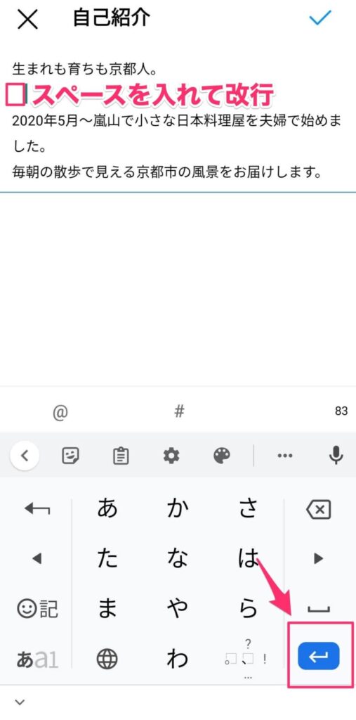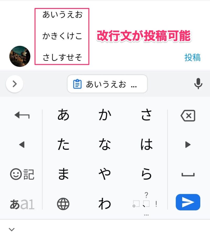 Androidの場合は、投稿文とプロフィールは通常操作で改行できます。キーパッド右下の改行キーで改行してください。