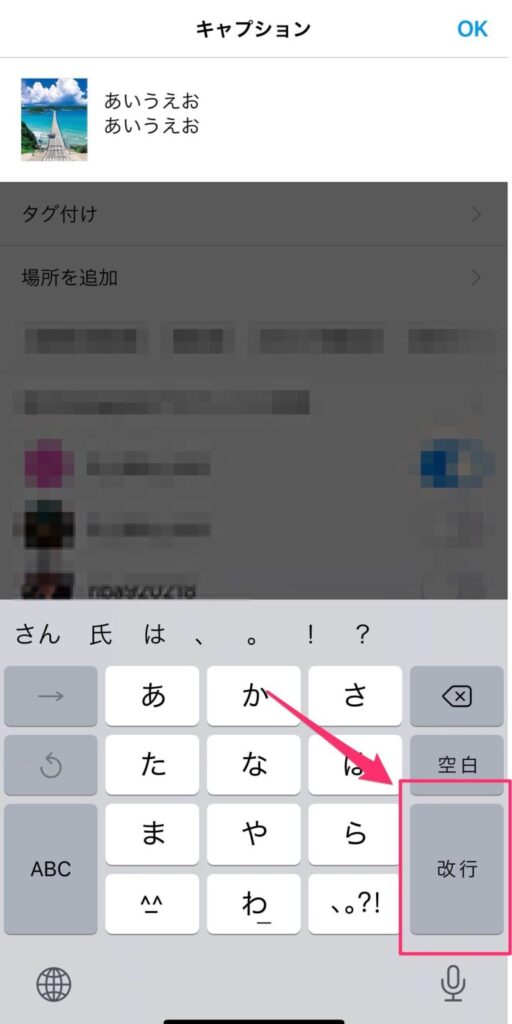 iPhoneの場合、改行は投稿文、コメント、プロフィールの全てで通常操作すれば有効になります。