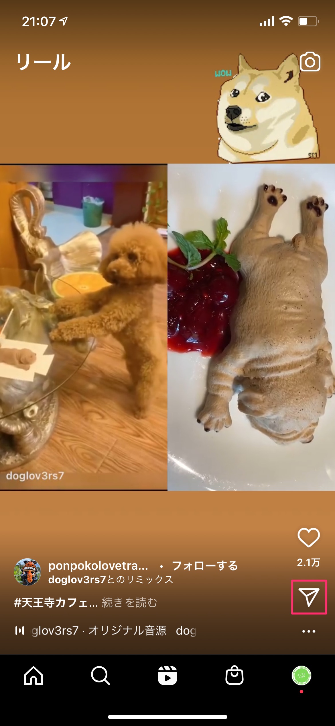 1. 保存したい動画のシェアボタン(紙飛行機みたいなアイコン)をタップ