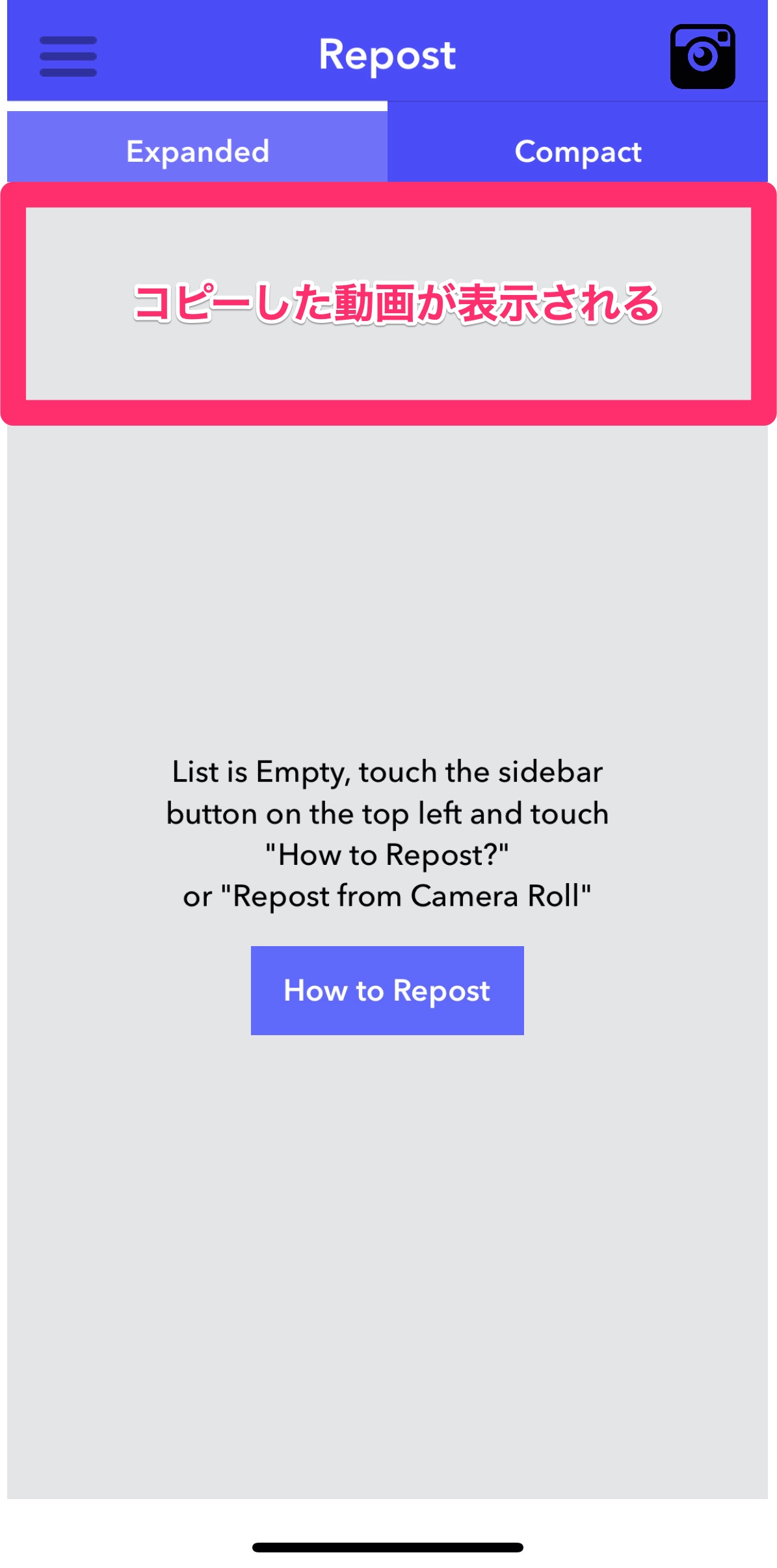 次にアプリを切り替えてリポストアプリに戻りましょう。すると、さっきコピーした動画が表示されています。