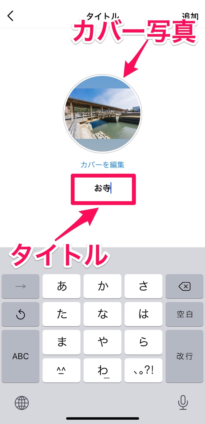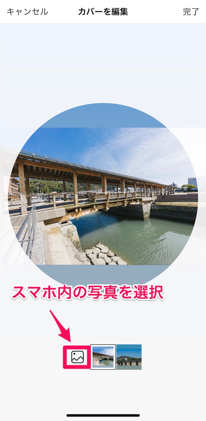 カバー写真は投稿の写真を選ぶことも出来ますし、左の写真の絵のようなアイコンをタップすれば、スマホ内の好きな写真にすることも出来ます。