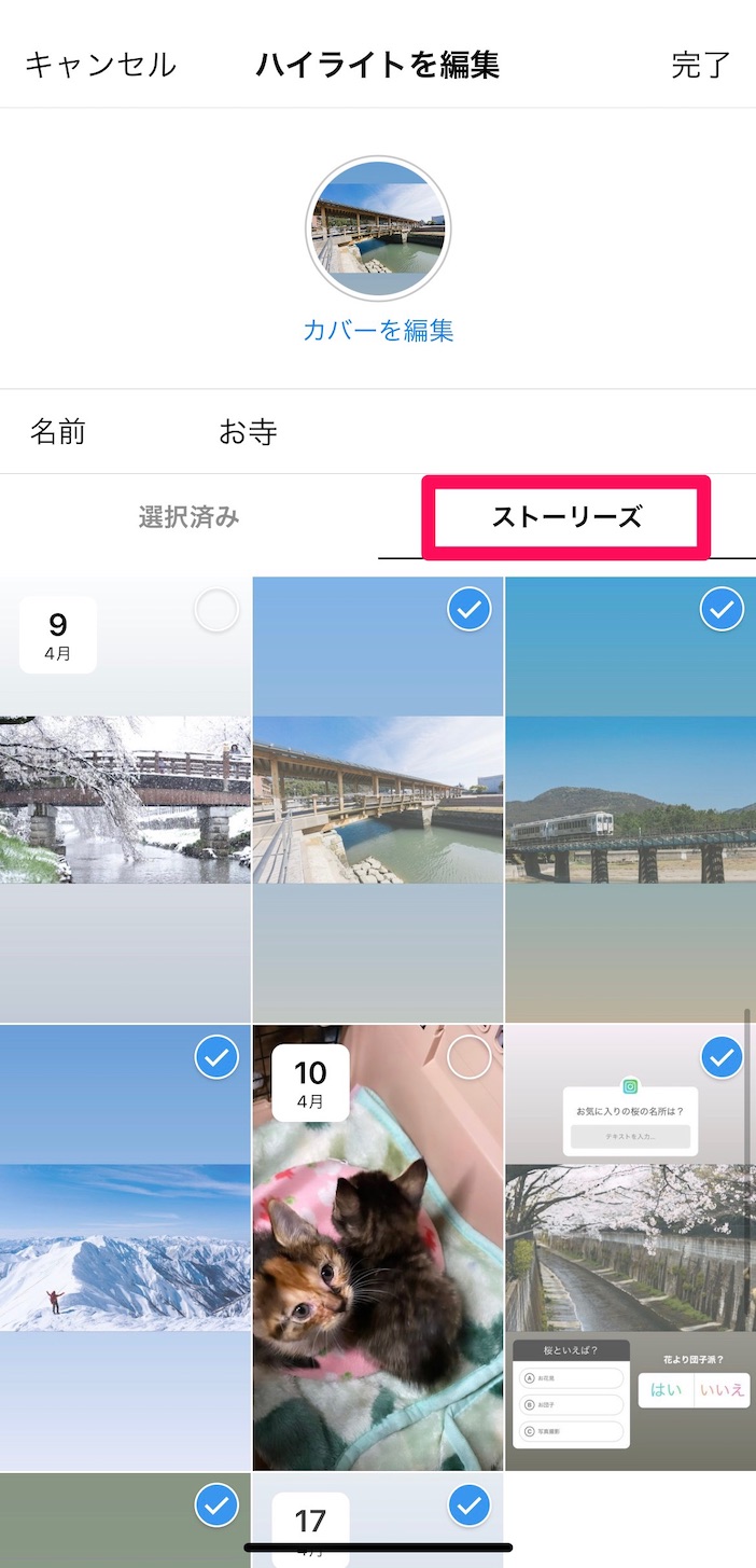 過去のストーリーズが表示されるので、ハイライトしたい投稿を選びます。複数選択も可能です。