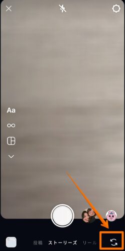 また、右下にある矢印マークをタップすると、内カメ(インカメ)・外カメを切り替えることができます。