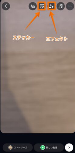 上のメニューから、「ステッカー」や「エフェクト」を選択してください。