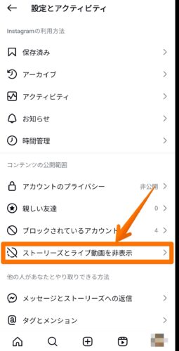 ③ストーリーズとライブ動画を非表示をタップ