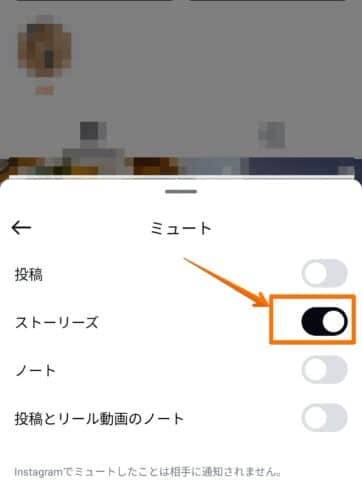 ミュートを選択し、「ストーリーズ」をONにします。