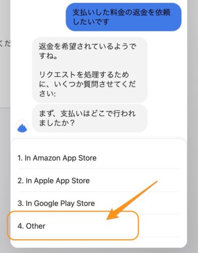 返金したい旨を伝えると、支払い方法をどこで行ったかの質問が来ます。
