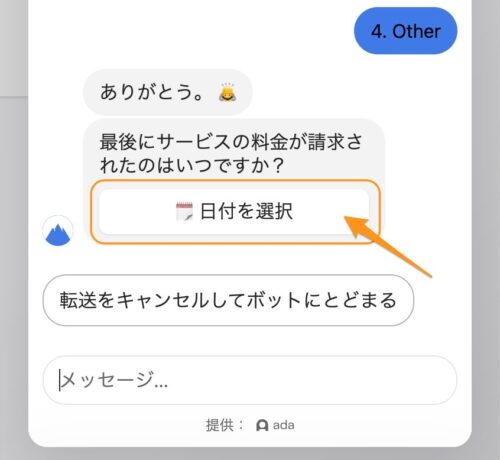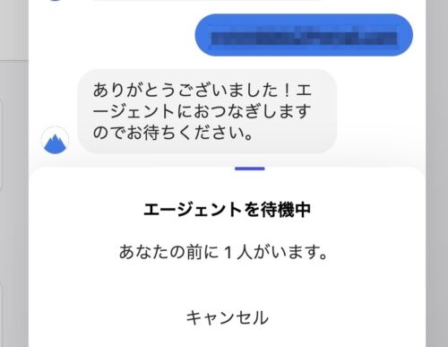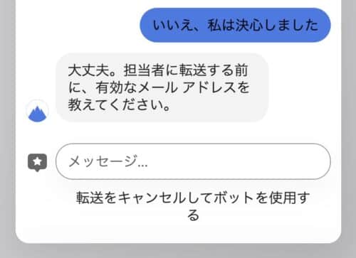初めはチャットボットとの会話で、途中から、実際の担当者さんとの会話になります。