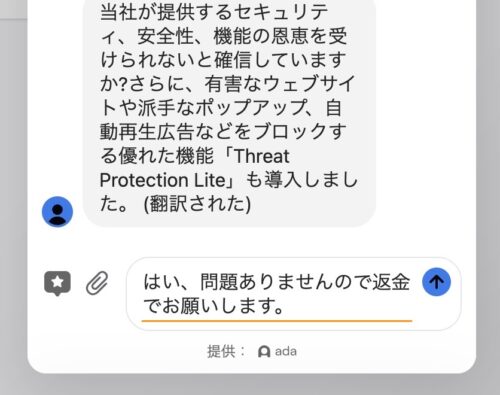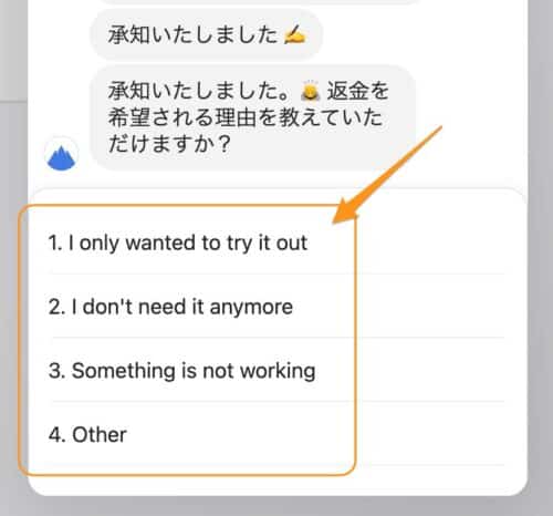 入力フォームなどで返金処理をするのではなく、必ず担当者と一回、チャットでのやり取りが必要となります。