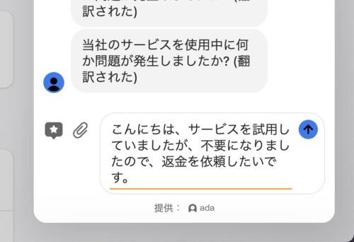今回は「こんにちは、サービスを試用していましたが、不要になりましたので、返金を依頼したいです。」という内容を入力しています。