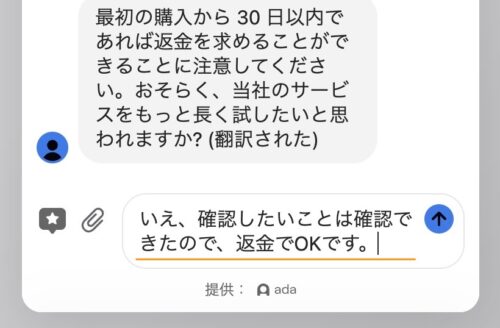 「もう少しサービスを試用しますか?」という内容が返ってきましたが、返金でOKです、という返答をしました。
