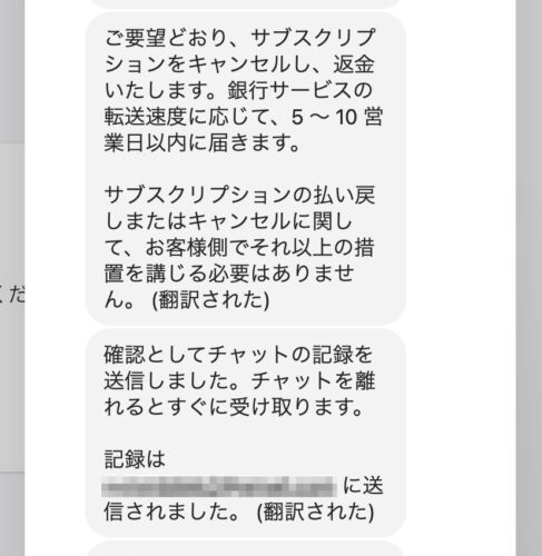 チャットを終了すると、登録しているメールアドレス宛に今回のチャットの履歴が送られ、返金処理は終了です。